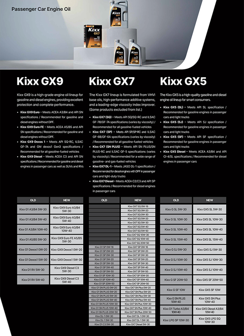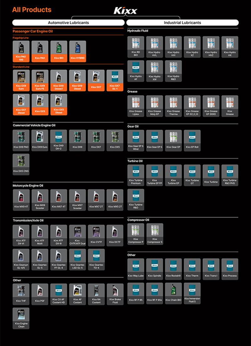 - Full Product Lineup Page: Provides an overview of Kixx’s complete lubricant product lineup.